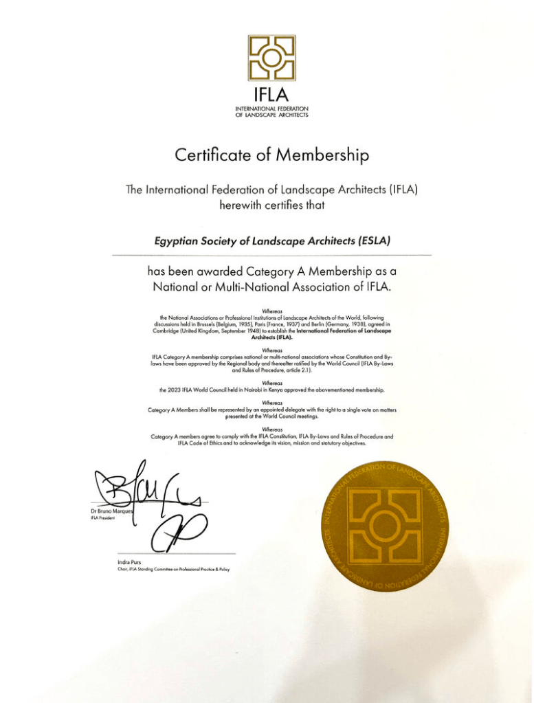 Today, we are pleased to announce the launch of the Egyptian Society of Landscape Architects (ESLA). The society is founded by group of professional, enthusiast and dedicated Egyptian landscape architects. It is indorsed and recognized by the International Defederation of Landscape Architects (IFLA), as the National Association representing the discipline in Egypt. ESLA is a non-governmental, non-partisan and non-profit association, created in accordance with the provisions of the Egyptian national law number 149 of the year 2019.