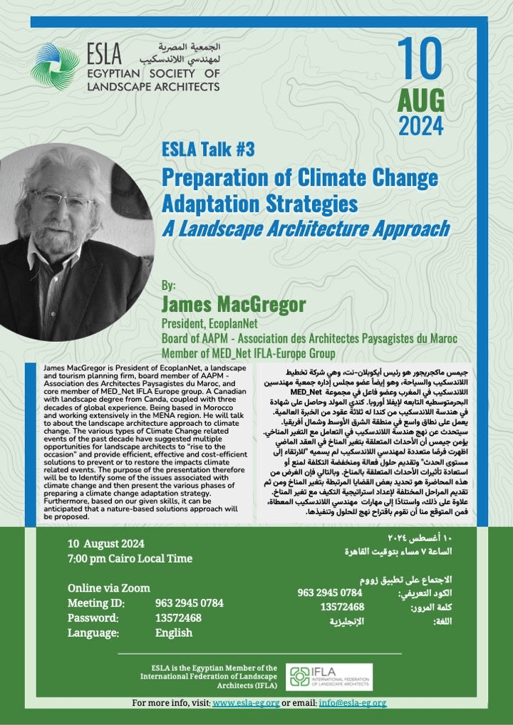 The Egyptian Society of landscape Architects (ESLA) is inviting you to our 3rd ESLA Talk that is going to be by James MacGregor and taking place Saturday 10th of August 2024 via Zoom.
