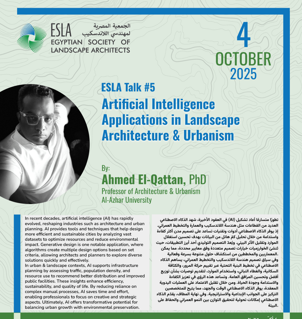 في العقود الأخيرة، شهد الذكاء الاصطناعي (AI) تطورًا متسارعًا أعاد تشكيل العديد من القطاعات مثل هندسة اللاندسكيب والعمارة والتخطيط العمراني. إذ يوفر الذكاء الاصطناعي أدوات وتقنيات تساعد على تصميم مدن أكثر كفاءة واستدامة من خلال تحليل كمّ هائل من البيانات بهدف تحسين استغلال الموارد وتقليل الأثر البيئي. ويُعدّ التصميم التوليدي أحد أبرز التطبيقات، حيث تُنشئ الخوارزميات خيارات تصميم متعددة وفق معايير محددة، مما يمكّن المعماريين والمخططين من استكشاف حلول متنوعة بسرعة وفعالية.